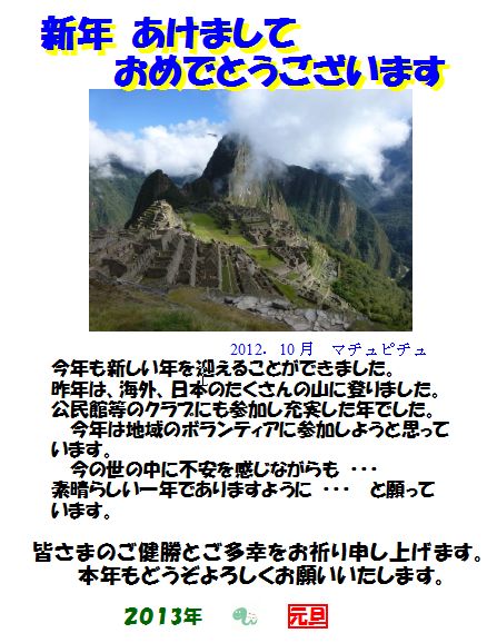 新しい年新しい年があけた。明けましておめでとうございます。![]() このページを見ていただいている方に年賀状です。 年賀状を差し上げた方は同じものになります。 不安な年ですが、そうはならないように頑張るしかありません。頑張りましょう。 |