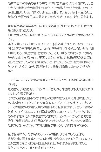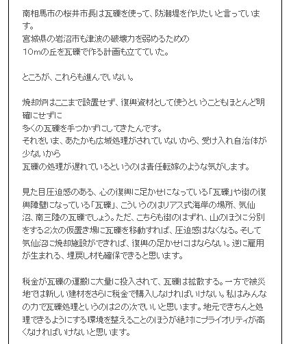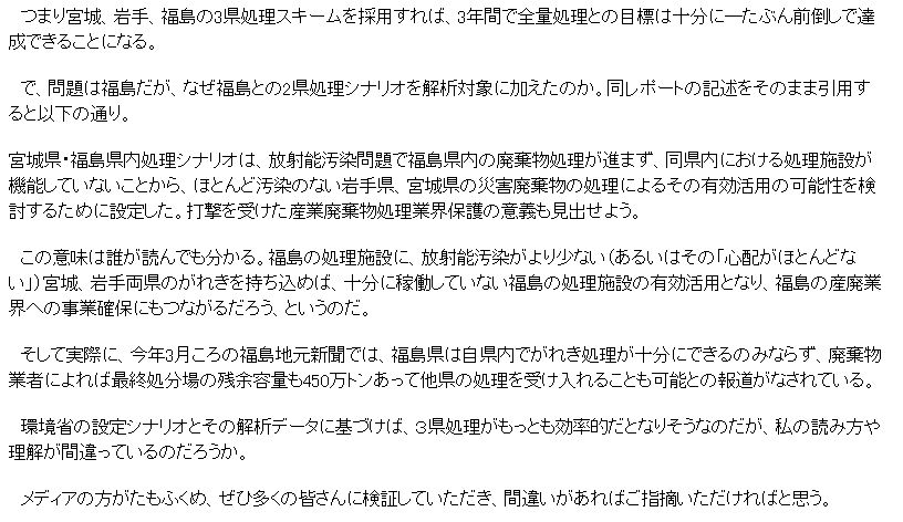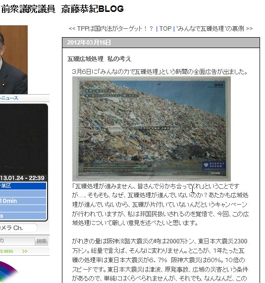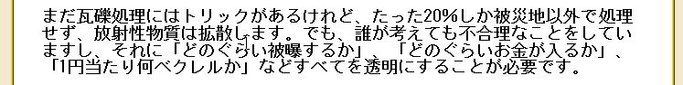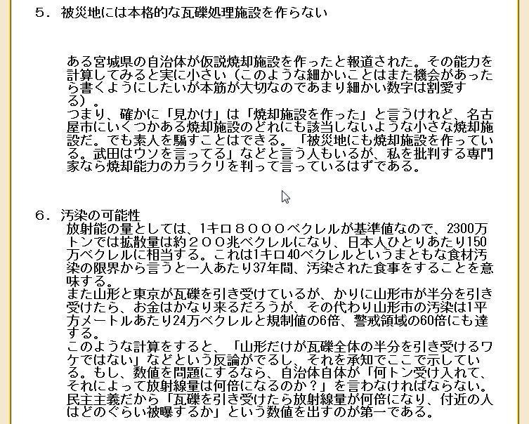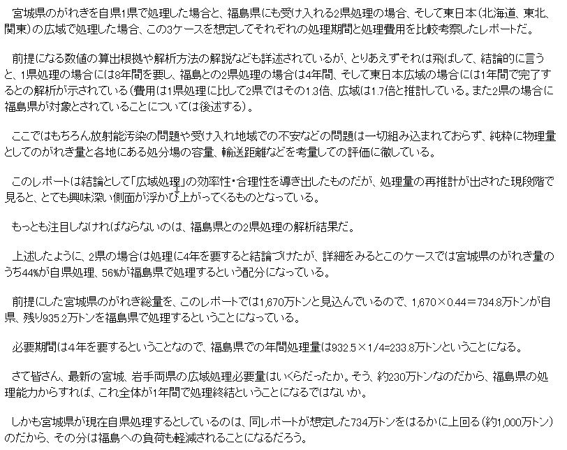 震災がれき処理昨日「あるこう会」の下見にいった。途中大阪府で「震災がれきの処理」について訴訟を起こした人たちの事を聞いた。私は放射能に汚染されている震災のがれきが 全国に散らばることは反対だ。そこで少し話し合ったが、具体的な数値を持っていなかったので、説明できなかったのが残念だった。震災がれきはなぜ広域処理をしてはだめなのかをまとめてみたい。 @放射能物質は拡散しないで封じ込めなければならない。現地で処理をするのが世界の原則。京大の放射能の専門家である小出先生も毎日放送の「種まきジャーナル」で言っていた。 A国の機関が言っていた震災瓦礫の量が後に発表されたものでは大きく減少し、現地でがれき処理施設を作れば、現地や隣接市町村で処理できる。 B広域処理は、税金の無駄使い。現地で処理をすれば安くつくのに、広域だと運搬等で費用が大きく高くなる。広域処理をするのはどこかのゼネコンを儲けさせるため。現地処理をすれば現地に金が落ち復興に役立つ。 現地の会社も、人手が必要になり雇用も生まれる。 簡単にまとめると以上だが以下引用で資料を上げる。 ![]() この資料は、どこかが丸儲けする手口を表している。 元民主党の議員が次のように述べている。
