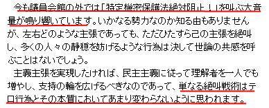 幹事長は訂正したが昨日石破幹事長がブログで書いたことで、「集会の自由・デモ行進の自由は、『集会、結社、言論及び出版のその他一切の表現の自由は、これを保障する』として憲法に保障されたものである」 「抗議活動をテロとみなしたことは、政治家が国民の声を聞こうとしない表れだと思う」と周囲から批判されて、「テロ」という言葉を使った部分を撤回する考えを示し「本来あるべき民主主義の手法とは異なるように思います」と改めブログを訂正した。 これは「上手の手から水が漏る」のことわざにあるように本心を隠していたのについポロっと出てしまったと考えるべきだろう。 火消しに追われ早々に訂正したものだが、本心はそのままでこれが現実として進みつつある。 「単なる絶叫戦術は本来あるべき民主主義の手法とは異なるように思います」と言う事になるが、 デモではシュプレヒコールは当たり前で、自分たちの思いを大きな声で訴えるのを禁止されたらデモをするなというに等しい。 自分たちの思いを大きな声で訴える事こそが民主主義の手法のひとつなのに。 石破は撤回したとはいえ、表現の自由を認めていないことには変わりないのだ。 |