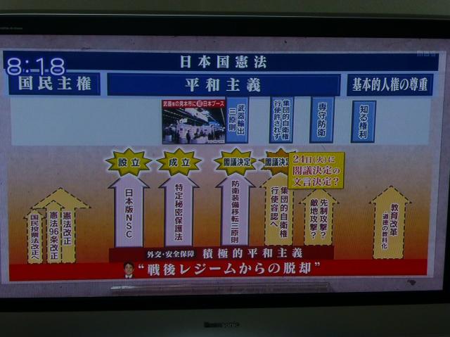 集団的自衛権行使容認閣議決定その後集団的自衛権行使容認閣議決定から1週間経った。新聞がTVが静かになった。県議の泣きに誤魔化されたのか。そして今日、軽減税率がTVの中心となる気配。 マスコミは全部安倍の味方をしている。 閣議決定直前に西日本新聞が、自民の新3要件は本当は公明が自民に提案していたのに自民の提案を公明が飲んだようにしていた事を報じたが、他のマスコミは報じない。 そして、閣議決定後それらしきことを報じている。 事前に報じれば反対運動が盛り上がったであろうに、終わってから報じるというのは何を意味しているのかが分かる。 下の写真でわかるとおり安倍によって日本の憲法はどんどん破壊されている。 ![]() ただ、集団的自衛権行使容認閣議決定に伴う自衛隊法など関連する法律は、来年の国会で提案すると安倍はオーストラリアで言っている。 あきらめてはいけない。戦いはこれからだ。 |