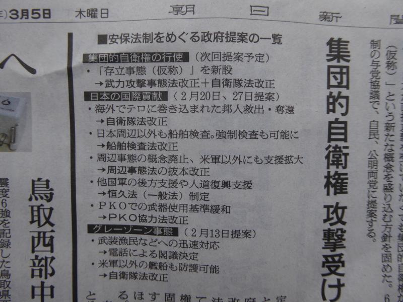 朝日新聞ここで公明がどれだけ頑張るかだが、ポーズだけして終わりだろう。平和の党があきれる結果になるだろう。 私たちが、戦争は嫌だ!9条を変えるな!の声を上げ大きな運動に出来るかが、法案の上程のストップを左右するだろう。 マスコミは腰が引けているが、どう動くかも勝負の分かれ目になる。 先日「集団的自衛権」についての学習会を開いたが、私達「9条の会」も頑張らなければならない。 |