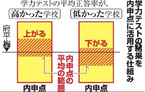 全国学力テストで、学校ごとの平均正答率を府全体の平均正答率と比較し、府教委が学校間の成績の差に応じて各校の内申点の平均値の範囲を決定。