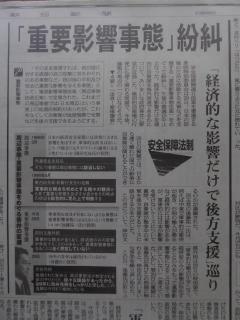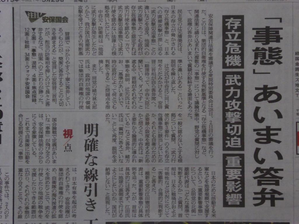 戦争法案の審議が始まった26日から国会で戦争法案につての審議が始まったが、安倍政権のお粗末が続く。 次の日の朝日新聞の朝刊の見出しに問題点が載せられる。 27日「国民生活に死活的影響」「存立事態」首相が判断基準 安保11法案 審議入り として