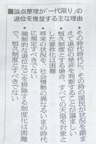 有識者会議の論点整理はこの点が抜け落ちている。意識的に抜かしたとしか考えられない。 退位問題は天皇の望む恒久法で、皇室典範の改正により決めることだと思います。