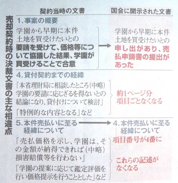 記事の最後に 「一方、毎日新聞は同日、朝日新聞が内容の違いを指摘している文書とは別の文書に、 『本件の特殊性』との文言があったと報じた。文書は、情報開示請求などに開示されたもので、この文言のほか、『貸付契約までの経緯』の項目があった。朝日新聞が確認したところ、項目の内容は、売却契約当時の決裁文書にあり、その後、項目ごとなくなっているものとほぼ同じだった。」 とある。
