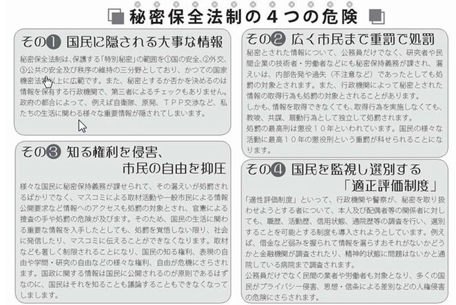 維持法に匹敵するものだそうだ。この法律は絶対に通してはならないものだ。各分野でも反対の声が起こりつつある。少し遅い気がするが、これからが正念場だ。 これが通ると 今右傾化している世の中、ますます戦前の世の中に近づいていくことになる。内容と危険性は下に挙げた。これは他のホームページから転載したものです。ぜひ読んでほしい。字が小さい ならば拡大して読んでほしい。