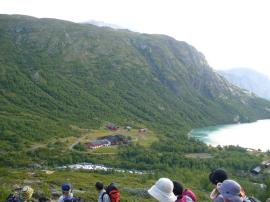 | 下に見えるのはイェンデ湖。湖の端にイェンデブーがある。これから崖を下る。昨日よりは安全だった。 | イェンデス ハイムからの船。ここまでは、船でも来れる。大変だが尾根歩きが最高だ。 | やっと到着。 | 山小屋に着いてホッとしたところ。 |