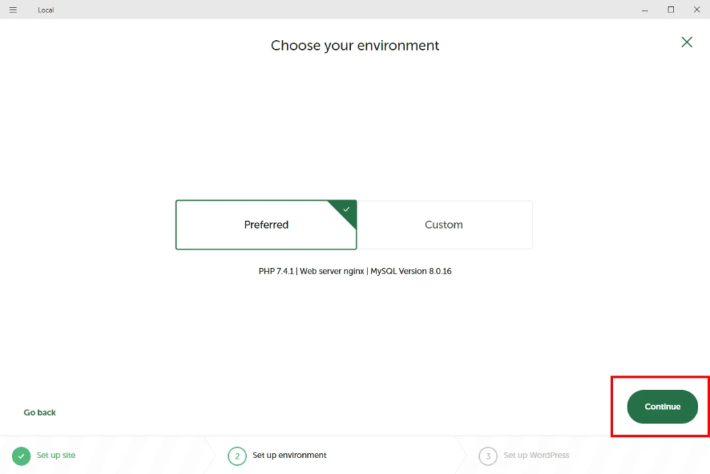 ここで本番環境と同じバージョンを選択できますが、特に指定がなければ「Preferred(推奨)」をクリックして「Continue」を押して次へ。