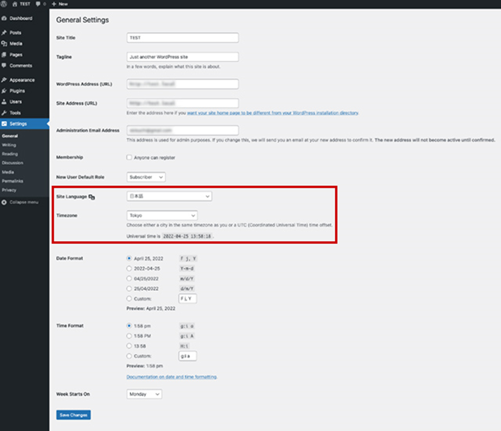 Site languageを日本語にし、Timezoneをutc+9、日時の表記や、曜日に始まりの設定をした後、変更を「save changes(保存)」をクリックしました。