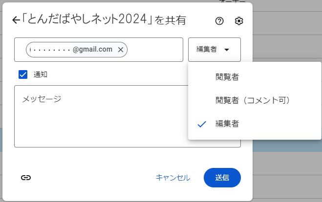 ユーザー名(アドレス)を入力欄に記入すると入力窓が次図のように変化する。アドレス欄右枠をクリックすると受け手への権限が指定できる選択窓が出るので、選択して送信を*