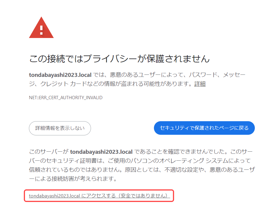 ・・・・・・・にアクセスする(安全ではありません) の文字列上をクリックする。