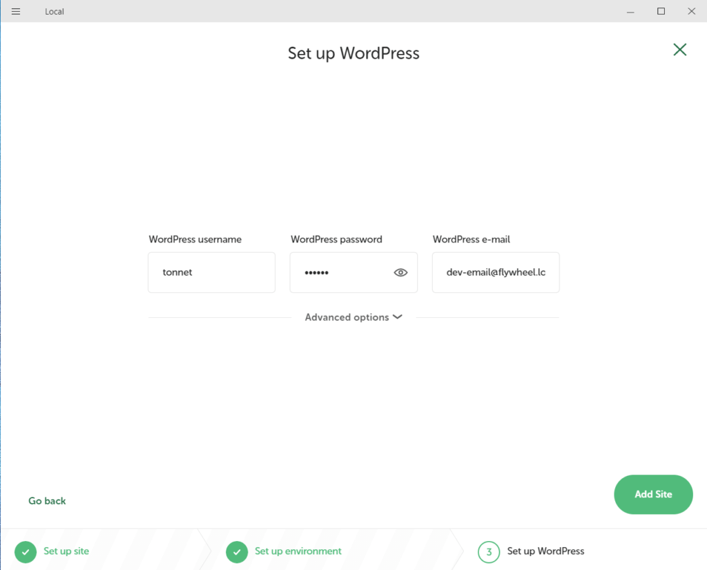 Username と Password を入力して、ここでは練習サイトなので、簡単な Username と Password を設定し(本番サイトは類推しがたいものにするが)両方とも admin admin とした。(Add Site) *