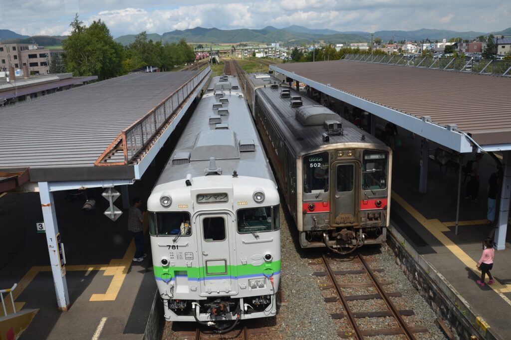 滝川からのキハ40(左)良野線のキハ54