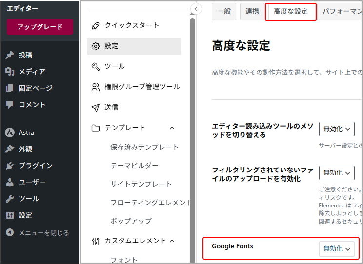 次に 高度な設定 タブ > Google Font 無効化 する(下図)