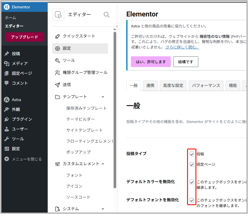 ダッシュボード > Elementor > エディター > 設定 > 設定画面 > 一般
