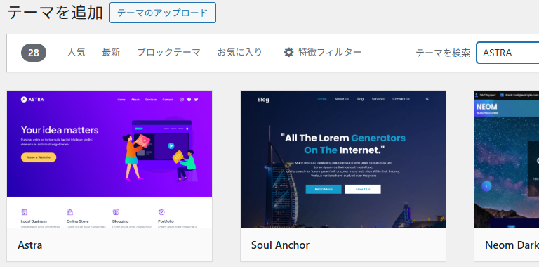 外観 > テーマ > テーマを追加 > アップロード画面 ここにASTRAが有れば、