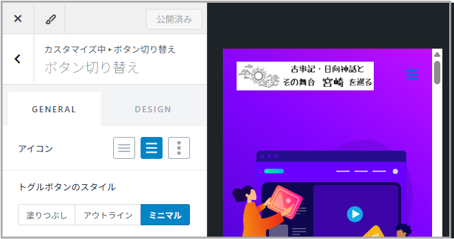 ② 表示ページにある[ サイトタイトルとロゴ ]ボタンで、必要ならサイトロゴの位置調整をする。:[ サイトタイトルとロゴ ]> GENERALタブでロゴ幅調整、DESIGNタブでマージン調整が出来る