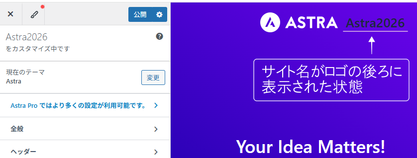 サイト名(ホームの表示 ここではロゴの後ろの ASTRA2026 )を消す