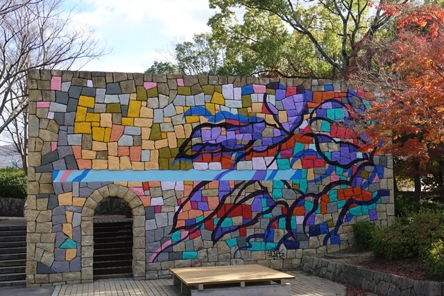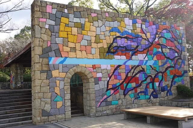 ミューラルとは壁画のことで、日本ではまだ知られていないようです。[広報とんだばやし]によりますと若者会議から提案され「Over the moon 緑あるまち」をテーマに世界で活躍するプロのアーティスト(TITI FREAKさん)が作成しました。大きな葉っぱがモチーフだそうですが、絵を見た人がそれぞれの解釈で楽しんでほしいようです。しかし広報見てなかったら落書きと思わないかな?ごめん!