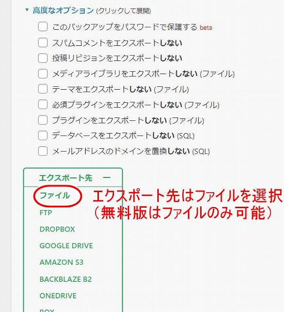 「高度なオプション」からエクスポート除外対象のファイルを選べる