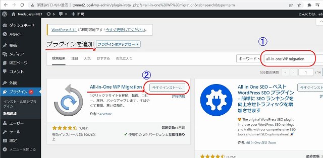 プラグインを追加 で ① All in One WP Migrasion検索
