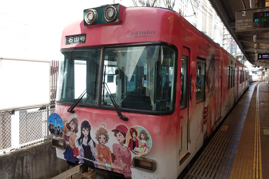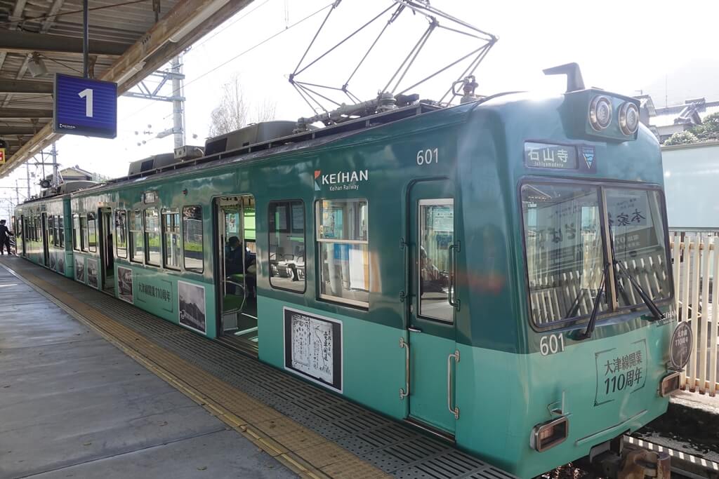 石山寺駅と坂本比叡山口駅(110周年記念ラッピング車)