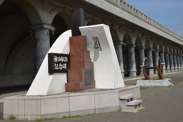 稚迫航路(稚内~樺太)の港と稚内桟橋駅跡の記念碑 (後方は宗谷本線を走っていた蒸気機関車C55形の動輪)