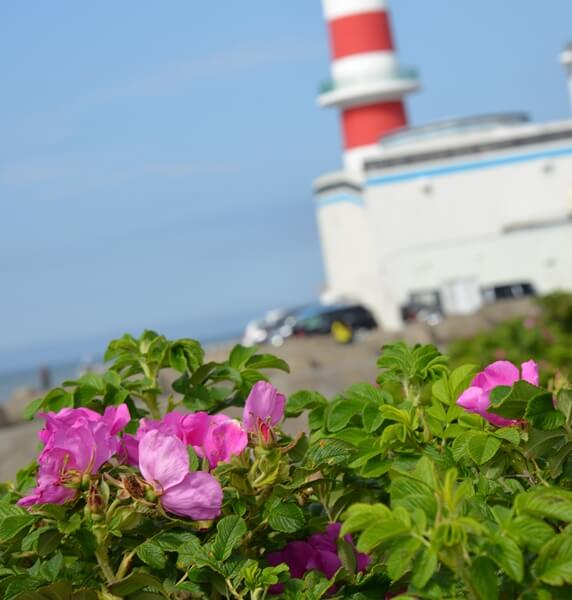 ノシャップ岬のハマナス(後方は稚内灯台、珍しく紅白に塗られています何故かな?)↓