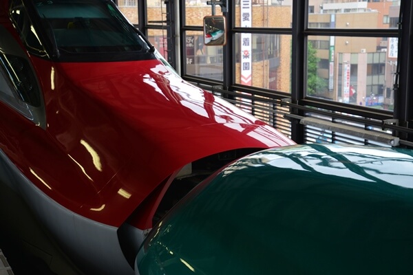 盛岡駅では「こまち」<E6系>の後方に「はやて」<E5系>の連結の様子が見学できる(すべて自動で連結される)