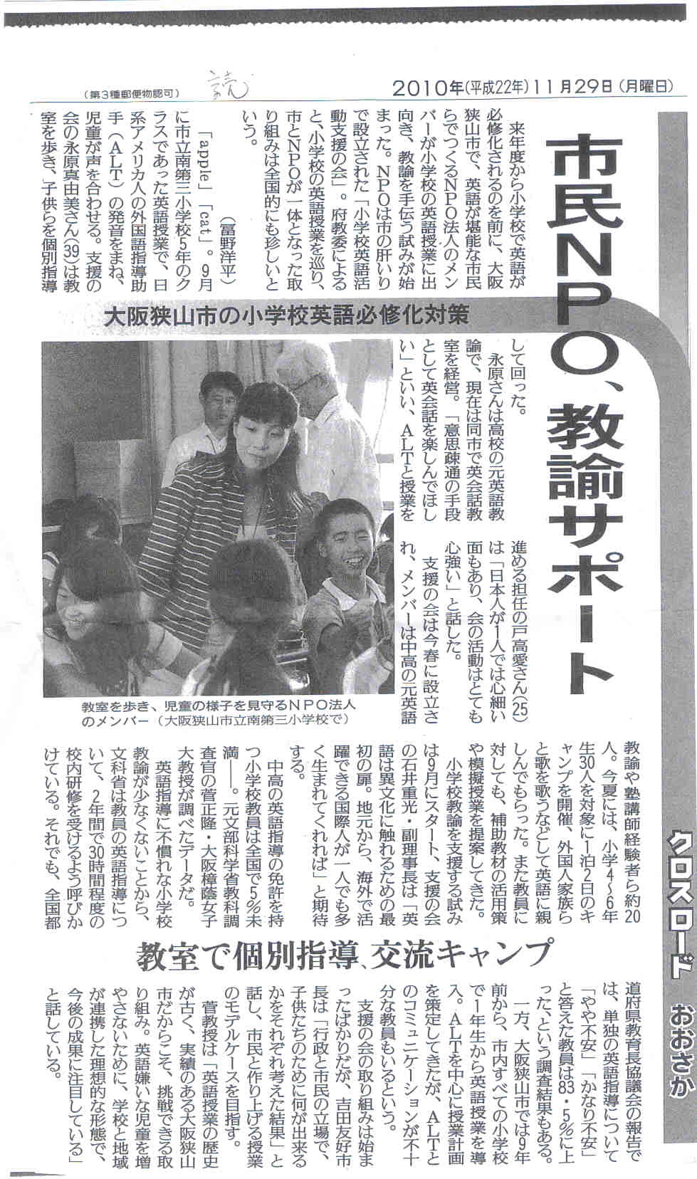「NPO大阪狭山小学校英語活動支援の会」の活動が読売新聞に紹介されました。